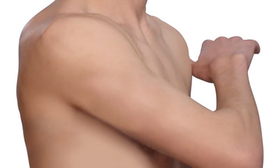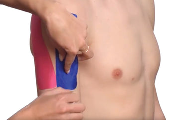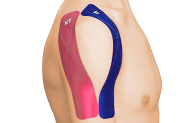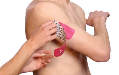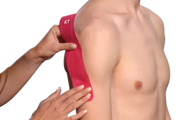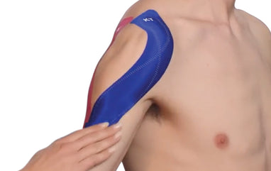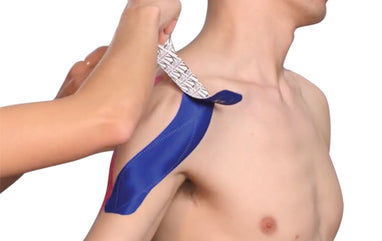 腕を開き、テープを10-20%上に引っ張りながら肩の前側に沿って貼付ける。