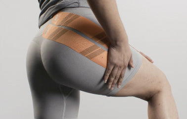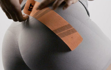 適度にストレッチをかけながら殿部を横切るようにテープを貼ります。