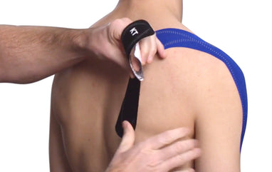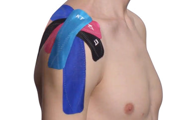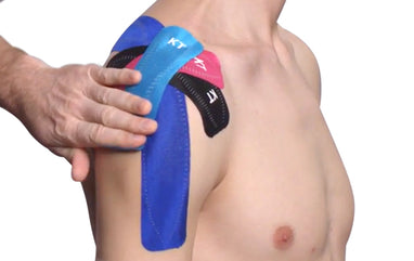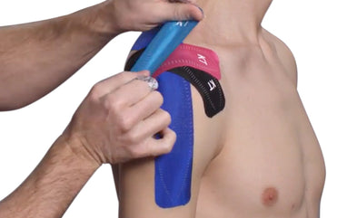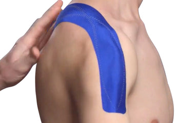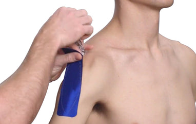 半分の長さに切ったテープの中央を肩鎖関節部分に当て、肩の前後に30-50%引っ張り貼付ける。
