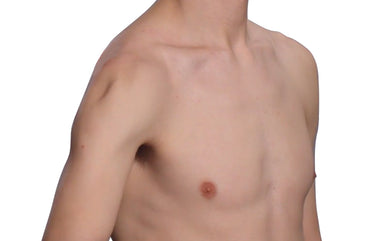 肩関節から10cm位下の腕の胸側に、テープの端3cm位を引っ張らずに貼付ける。