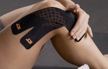 テープの最後3~5cmはストレッチをかけず、膝下の前面からやや内側に2番目のアンカーを貼ります。