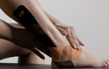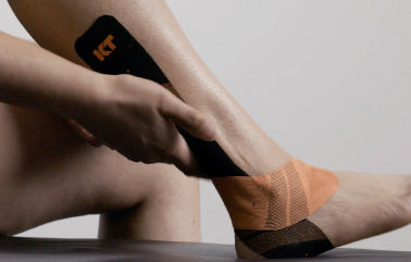 テープ中央部分の裏紙を剥がします。適度にストレッチをかけながらくるぶしの後ろを通るようにしてスネの外側にテープを貼ります。