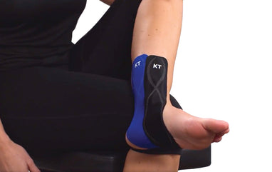 椅子に座り、貼る方の足首を反対側の膝の上に交差させる。 つま先をすね側に反らし、やや外側に向けておく。